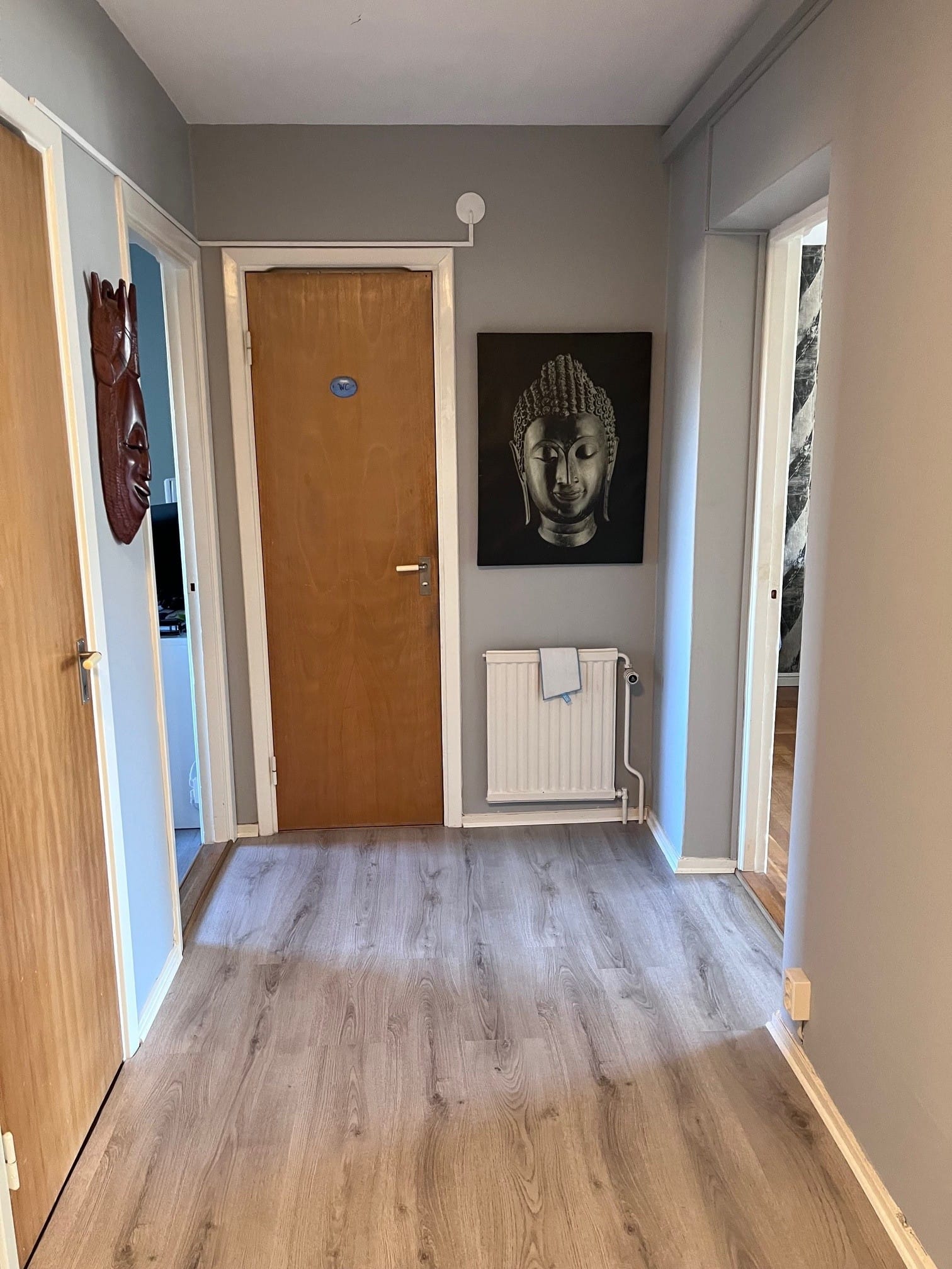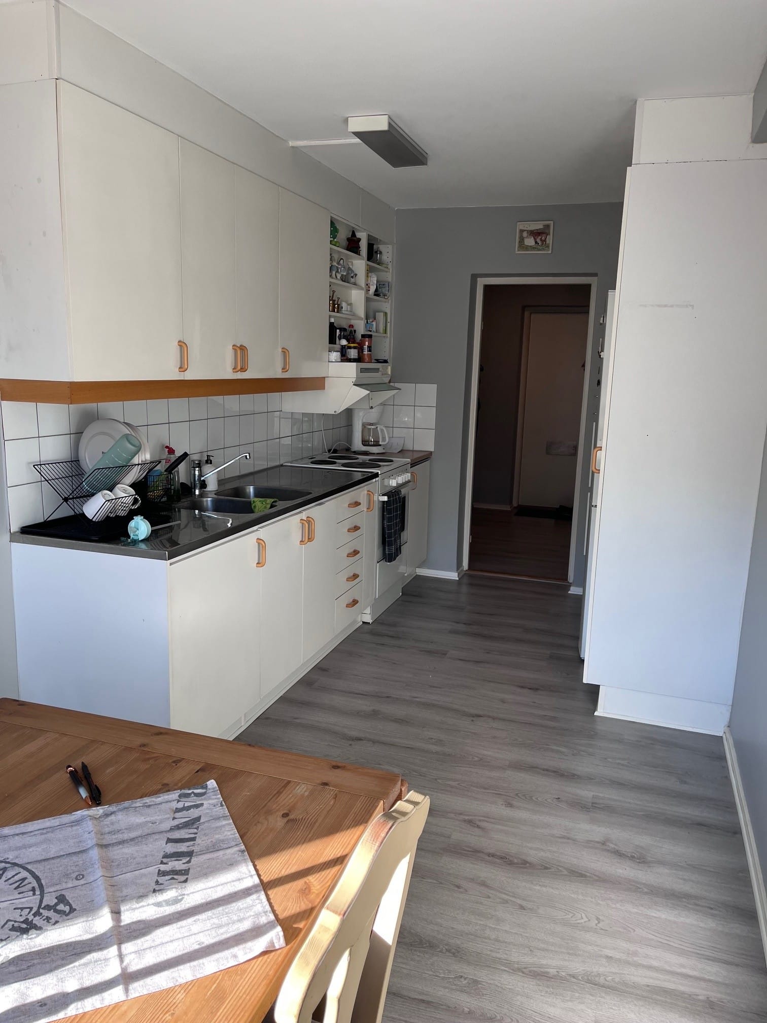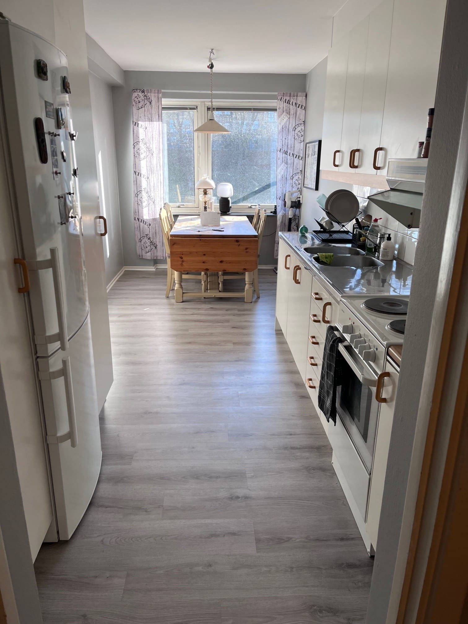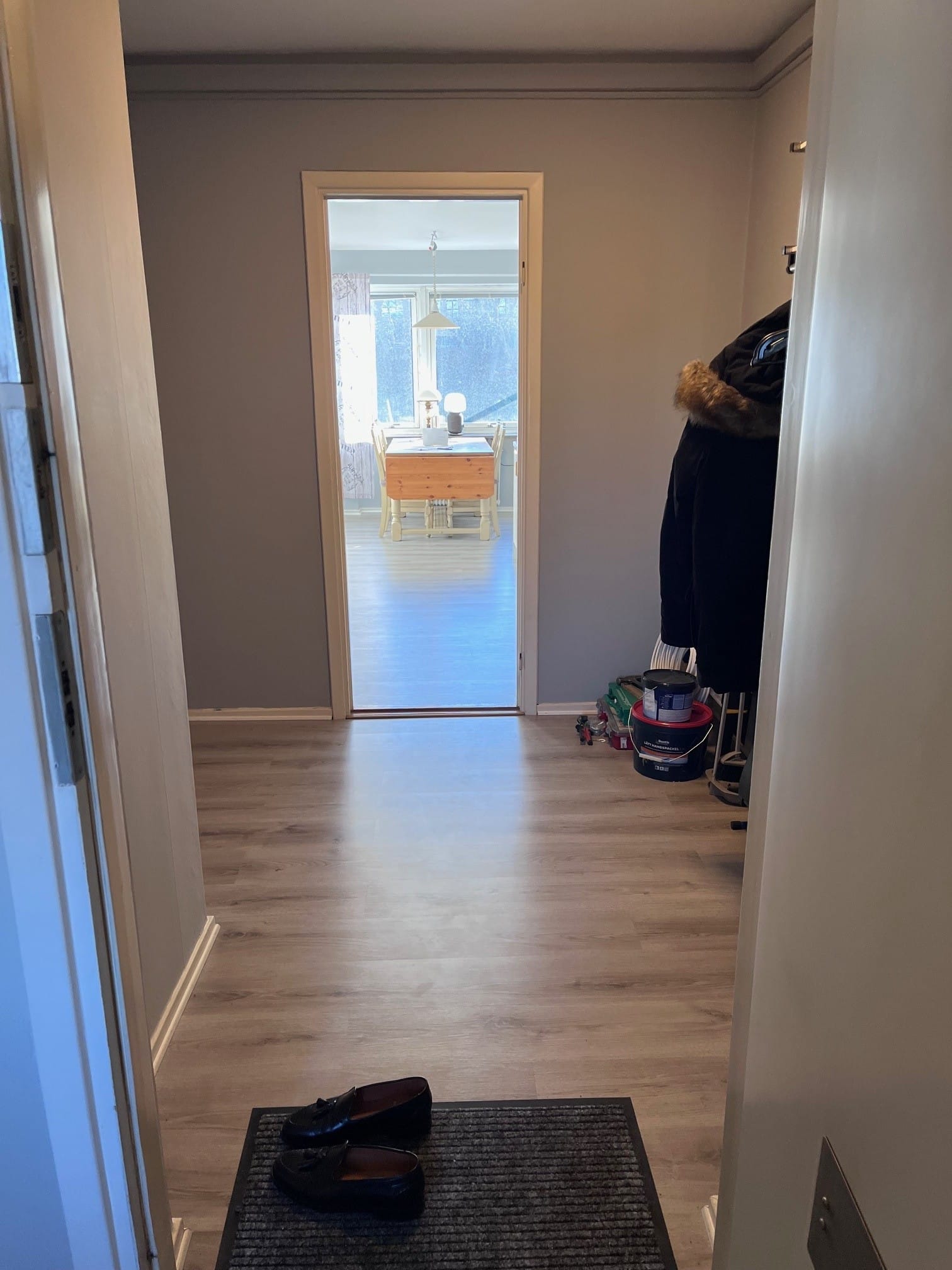 Lägenheten är omålad och har nya golv i samtliga rum, vilket ger ett fräscht helhetsintryck.