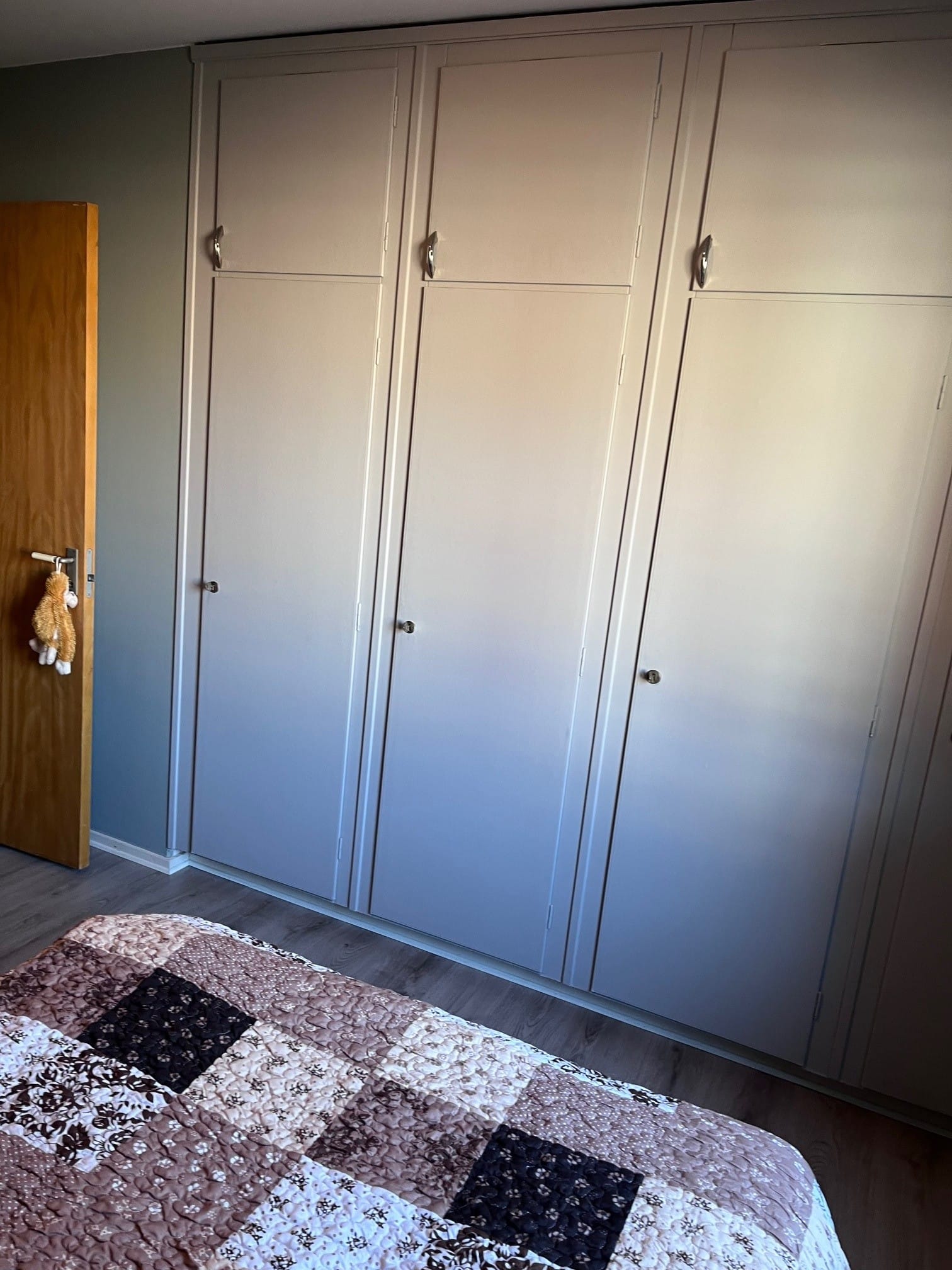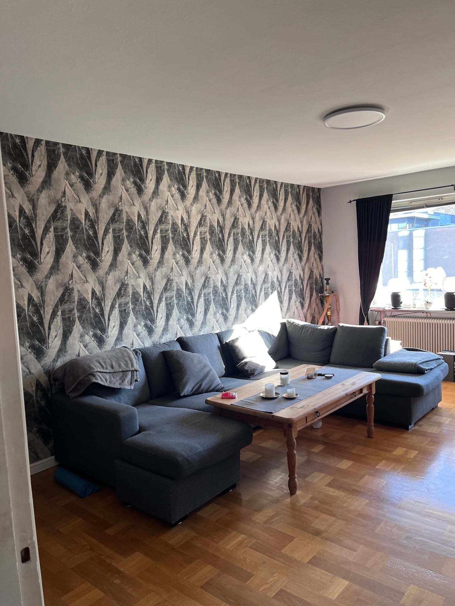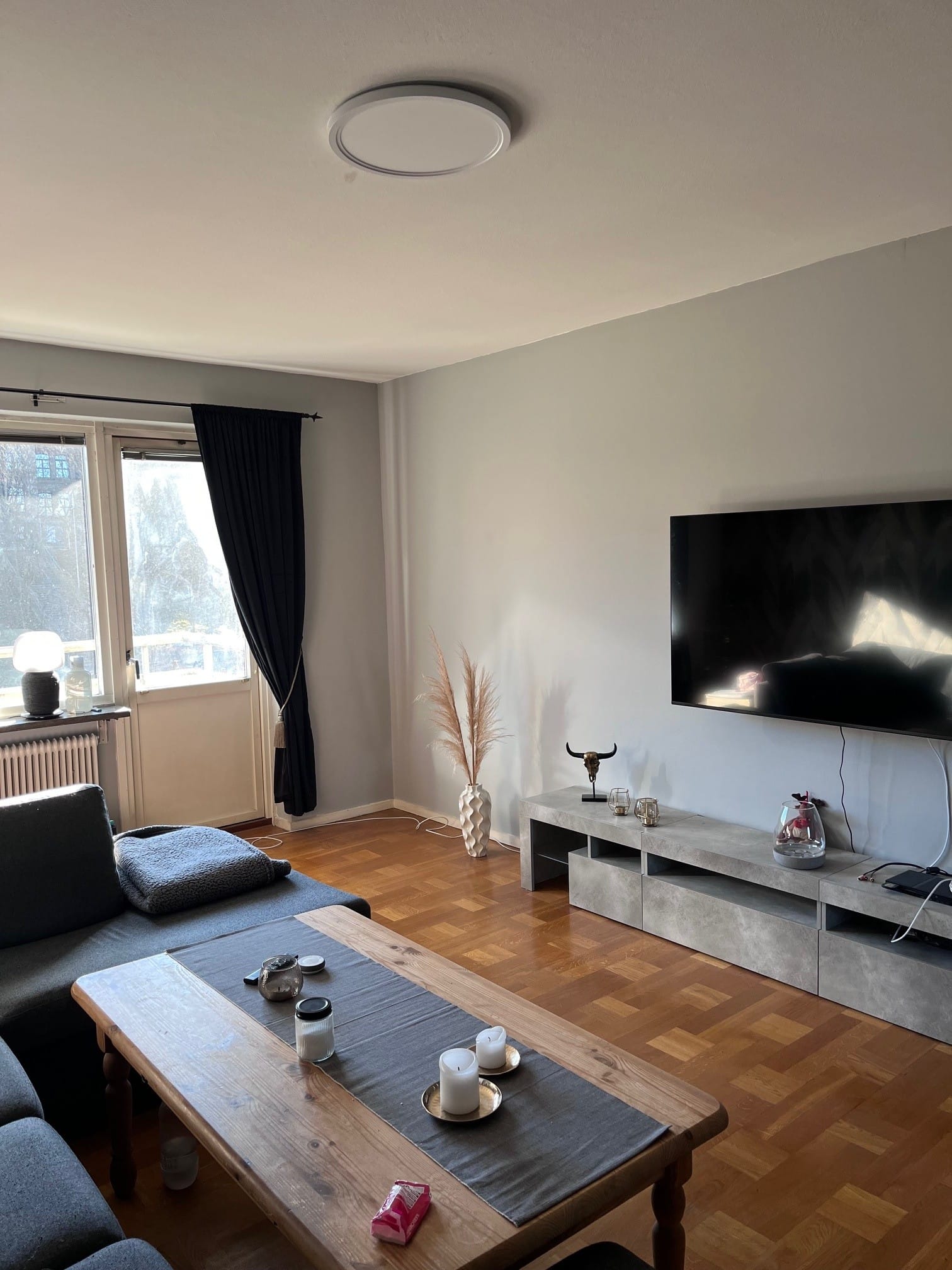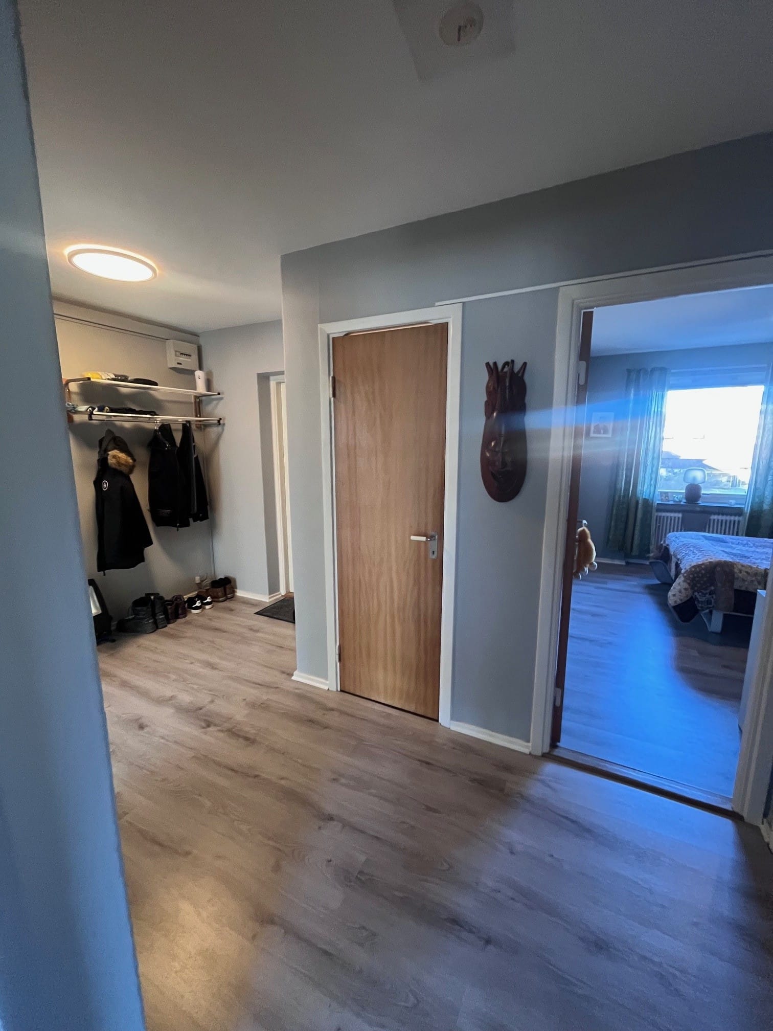 Lägenheten är omålad och har nya golv i samtliga rum, vilket ger ett fräscht helhetsintryck.